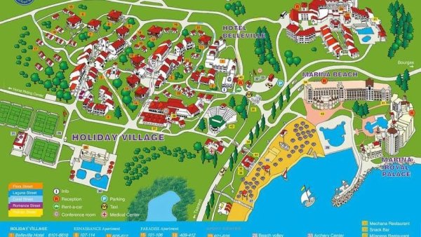 czterogwiazdkowy; nowoczesny; 238 pokoi, kilka budynków, 2-4 piętra, winda; na terenie Duni Royal Resort składającego się z 5 hoteli; całodobowa recepcja; sala konferencyjna dla ok. 120 os. (na terenie resortu łącznie 4 sale, w Marina Beach dla 140 os., w Holiday Village dla 15 os., w Pelican dla 30 os.); akceptowane karty kredytowe: Visa, MasterCard; goście mogą korzystać z całej infrastruktury Duni Royal Resort (z wyjątkiem restauracji, barów oraz basenów w części Duni Marina Royal Palce)