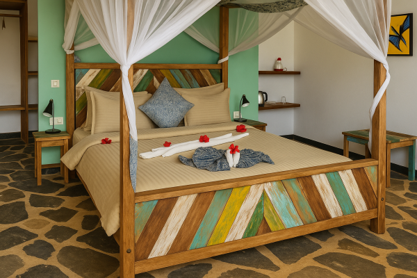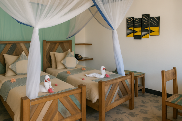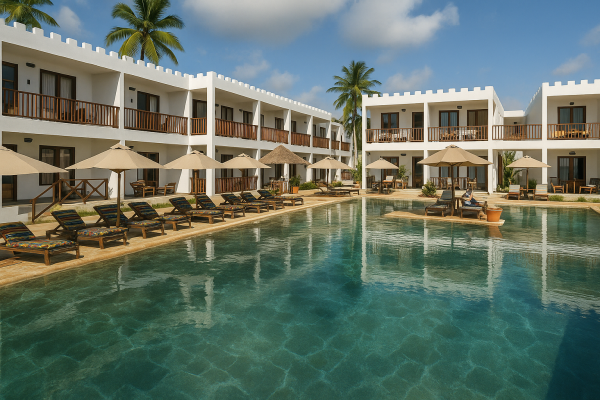 Zanzibar Bay położony na wschodnim wybrzeżu Zanzibaru to stosunkowo nowy hotel, bo wybudowany w 2018 roku. Pokoje są komfortowo wyposażone, a wnętrza utrzymane są w lokalnym charakterze. Wypoczywać można na piaszczystej plaży tuż przy obiekcie, lub przy basenie. Osoby spragnione relaksu mogą skorzystać z oferty masaży. Osoby aktywne z pewnością udadzą się do hotelowej siłowni. Oferta all inclusive stanowić będzie dopełnienie udanych wakacji.