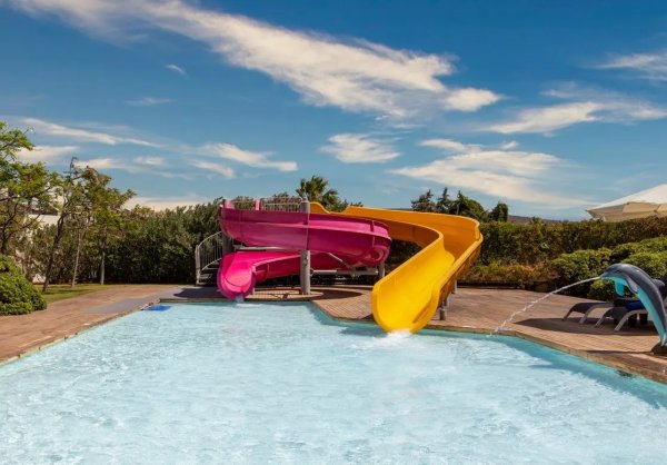 basen, nieregularny kształt, słodka woda; brodzik, słodka woda; basen dla dzieci ze zjeżdżalniami, nieregularny kształt, słodka woda; przy basenach bezpłatne parasole, leżaki, materace i ręczniki