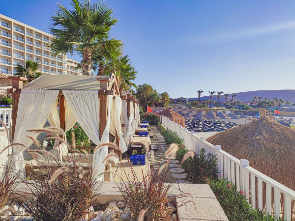 bezpośrednio przy hotelu; piaszczysta; łagodne zejście do morza; drewniany pomost do opalania; bezpłatne parasole, leżaki, materace i ręczniki