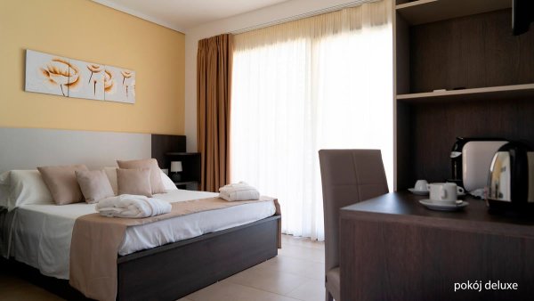 2-os. (możliwość 1 dostawki); ok. 20 m²; zadbany; indywidualnie sterowana klimatyzacja; łazienka (prysznic, wc; suszarka, zestaw kosmetyków); telewizja satelitarna; telefon; sejf; część pokoi z balkonem lub tarasem; widok na ogród lub morze; za opłatą: minibar (płatny wg konsumpcji)