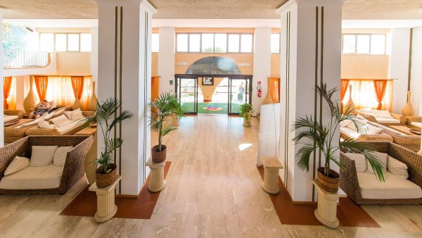 śniadanie (7.30-9.30), obiad (13.00-14.30), kolacja (20.00-21.30) w formie bufetu w restauracji głównej; do obiadu i kolacji woda, wyznaczone napoje bezalkoholowe z dystrybutora lub wino w karafce; wyznaczone napoje bezalkoholowe w barze głównym (10.00-22.00); wymagane noszenie opasek soft all inclusive.