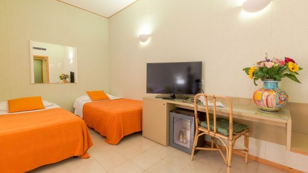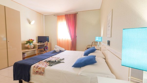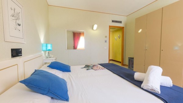 2-os. (możliwość 1 dostawki dla os. dorosłej lub 2 dostawek dla dzieci); skromny; ok. 18-22 m²; klimatyzowany; łazienka (prysznic lub wanna, wc, suszarka); telewizja satelitarna; telefon; internet bezprzewodowy; sejf; mała lodówka; balkon (stolik i krzesełka); łóżeczko dla dziecka do 2 lat (płatne: ok. 10 EUR/doba; na zamówienie przed przyjazdem)