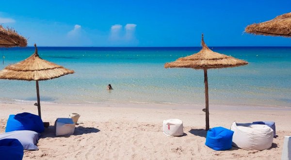 bezpośrednio przy hotelu; piaszczysta; łagodne zejście do morza; przejście przez teren hotelu; bezpłatne parasole, leżaki, materace; ręczniki za kaucją: ok. 25 TND