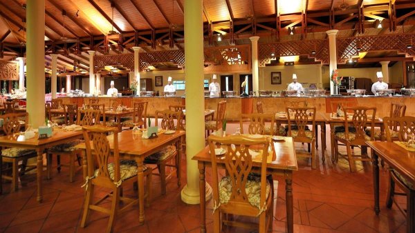śniadanie (7.30-10.00), obiad (12.30-14.00), kolacja (19.30-21.00) w formie bufetu w restauracji głównej; do obiadu i kolacji nielimitowana woda, limitowane napoje chłodzące lub lokalne piwo serwowane w szklankach; wymagane noszenie opasek soft all inclusive