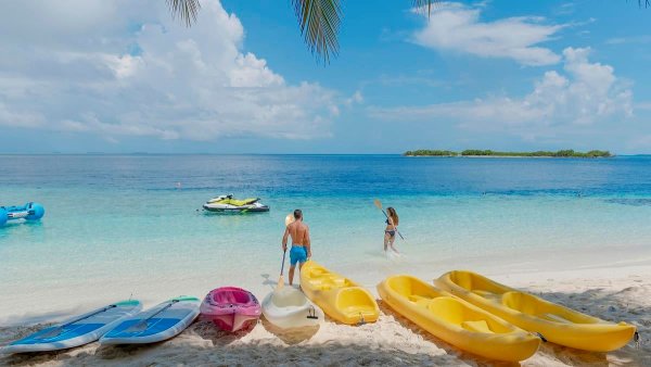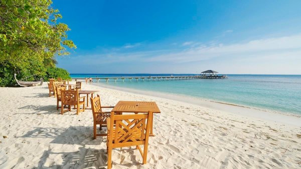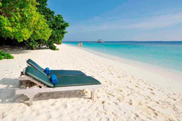 bezpośrednio przy hotelu; piaszczysta; łagodne zejście do morza; bezpłatne parasole, leżaki, materace i ręczniki; ze względu na rafę koralową dookoła wyspy kamienny falochron