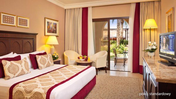 2-os; ok. 38 m²; elegancki i luksusowy; klimatyzowany; łazienka (wanna lub prysznic, wc, suszarka, zestaw kosmetyków); internet bezprzewodowy; telewizja satelitarna; sejf; zestaw do kawy/herbaty; minibar (płatny wg konsumpcji); balkon lub taras (stolik i krzesełka); widok na ogród; widok na basen;